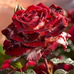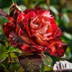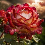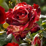 Róża pnąca o jaskrawych, żółto-pomarańczowych kwiatach z lekko czerwonym odcieniem na brzegach płatków. Średni zapach, szybki wzrost, liczne kwiaty w sezonie. Idealna do ogrodów, łuków i pergoli.