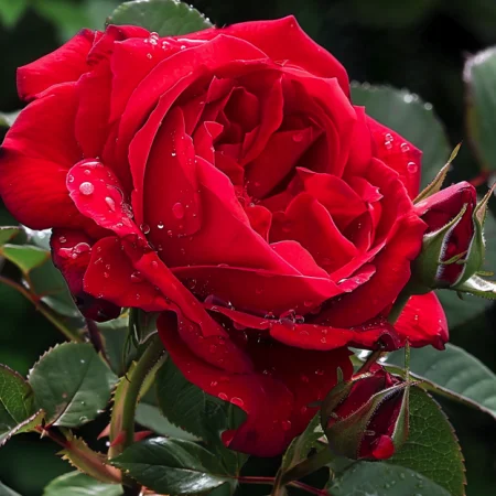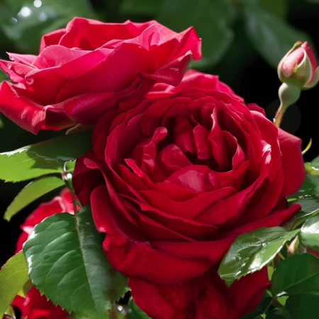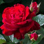 Piękna odmiana z eleganckimi kwiatami i przyjemnym zapachem. Kwiaty są intensywnie czerwone z pomarańczowymi odcieniami, tworząc ciepły i żywy wygląd. Krzew jest zdrowy, z gęstym zielonym listowiem, odpowiedni do ogrodów i nasadzeń dekoracyjnych. Obficie kwitnie przez sezon i jest stosunkowo odporny na choroby.