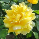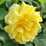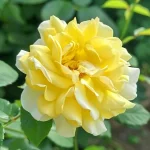 róża floribunda o jasnożółtych, pomarszczonych kwiatach z frędzlami, wysokość 50–60 cm, powtarzające kwitnienie i dobra odporność na choroby. Idealna do ogrodów, rabat i pojemników.